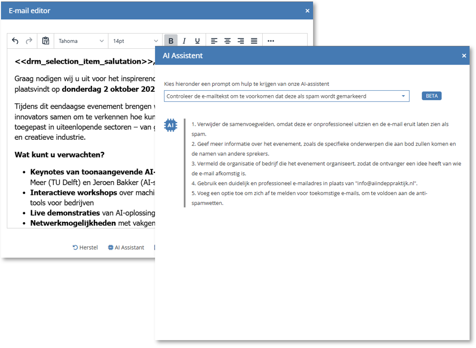 Cette première version est disponible dans la plateforme de mailing et constitue la base voor bredere toepassingen. In toekomstige updates zal de AI Assistent ook beschikbaar komen op andere plekken binnen het CRM.
