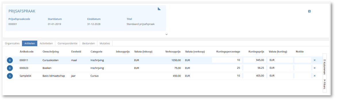Général | Possibilité d’enregistrer des accords tarifaires en pourcentage. Om prijsindexatie uit te voeren is het handig om prijsafspraken in de vorm van percentages te kunnen vastleggen, zodat deze ook automatisch mee kunnen stijgen (zie het volgende issue over prijsindexatie). In de huidige situatie kon dit via een vaste kortingsprijs. Dat blijft uiteraard ook nog steeds mogelijk.