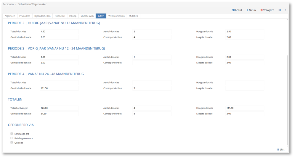STB Goede Doelen | Op het tabblad 'Giften' bij de persoon is nu ook de vorm van donatie (Gedoneerd via) opgenomen, zodat deze ook in filters gebruikt kan worden.
