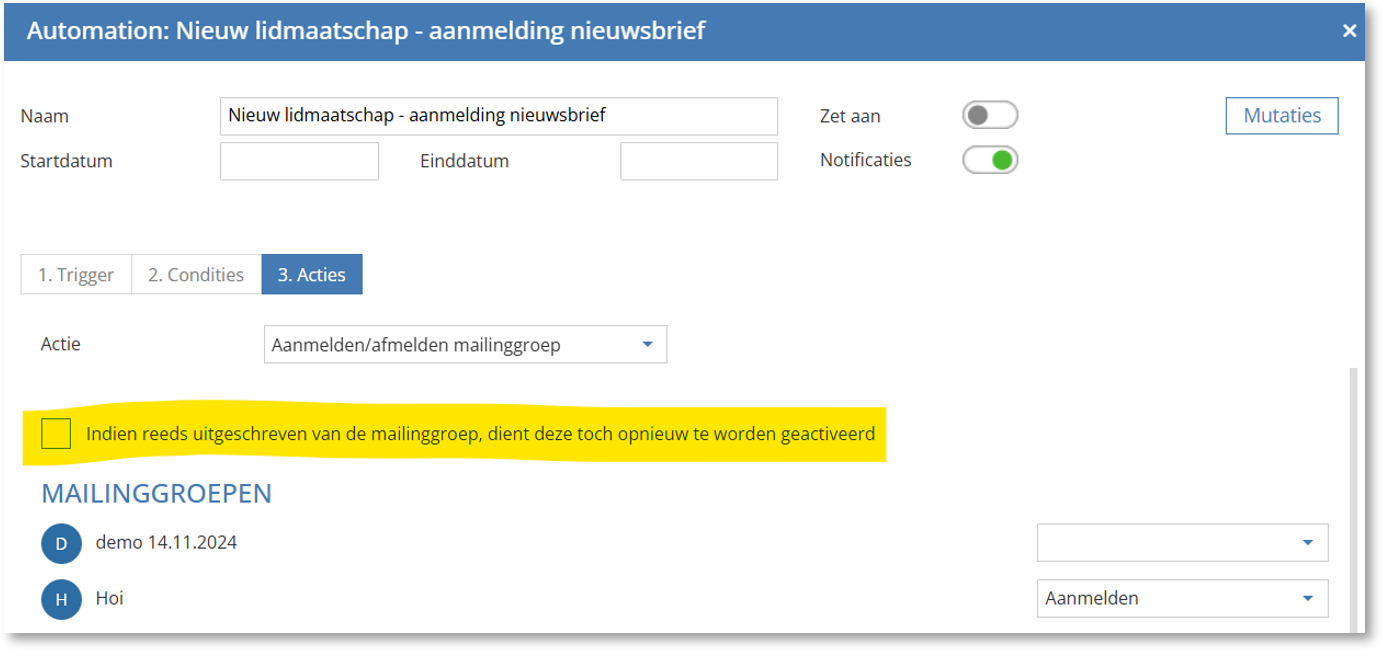 Algemeen | Bij de Automation-actie om in- of uit te schrijven voor een mailinggroep, is het nu optioneel om personen die al eerder hebben uitgeschreven voor een mailinggroep wel- of niet opnieuw in te schrijven.