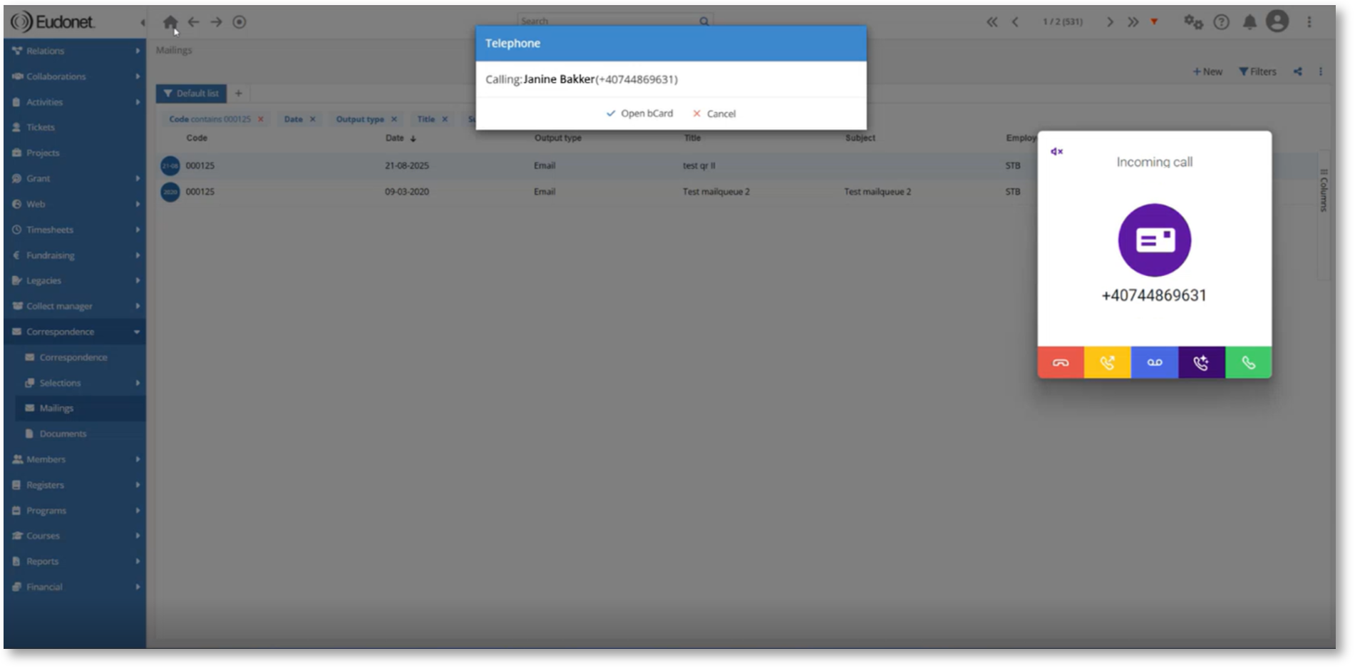 - Direct klantoverzicht: Bij een inkomende oproep wordt automatisch de bijbehorende persoons- of organisatiekaart in het CRM geopend, zodat je direct alle relevante informatie bij de hand hebt.