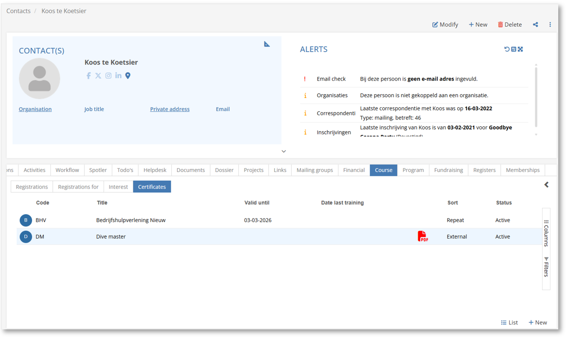 - Het is nu mogelijk om externe certificaten te uploaden, zodat deze zichtbaar zijn onder het tabblad certificaten. Hiervoor kan een specifiek type worden aangemaakt 'Extern certificaat'. Het is dan mogelijk daar direct een pdf versie van het certificaat aan te koppelen. Dit maakt het overzicht over behaalde certificaten nog meer compleet!