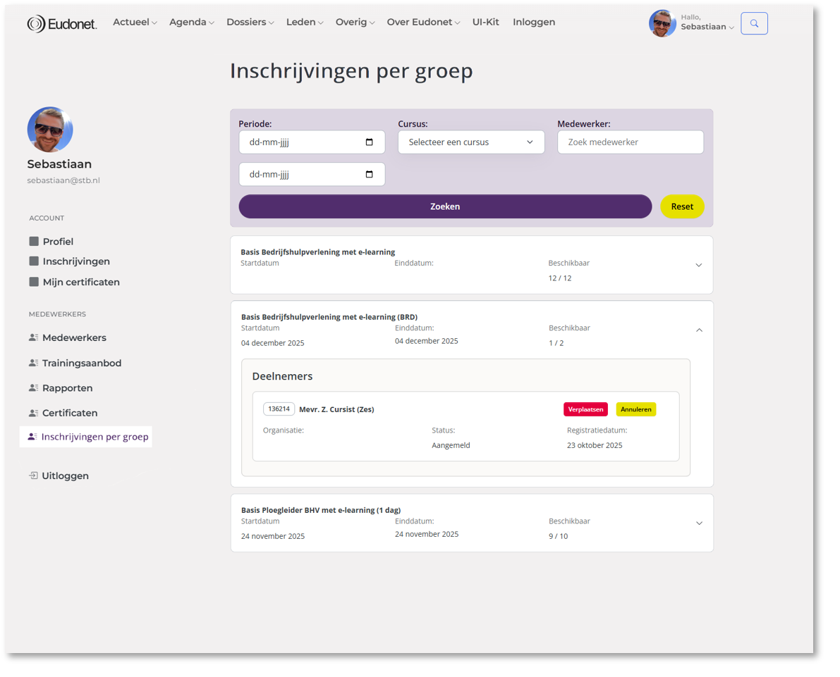 Als contactpersoon van een organisatie is het nu mogelijk om een lijst te zien van alle groepen waar medewerkers voor zijn ingeschreven. De groep kan worden uitgeklapt om te zien welke medewerkers daar aan deelnemen. Het is tevens mogelijk om de groepen te filteren op bijvoorbeeld het type cursus of de periode.