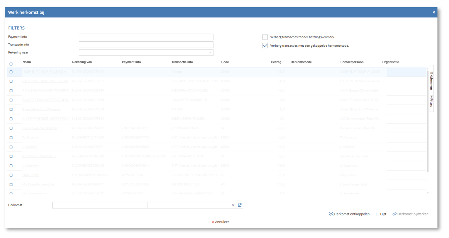 In de lijst is nu zichtbaar aan welke persoon een banktransactie is gematcht. Dit geeft direct meer inzicht of de donateur al bekend is.