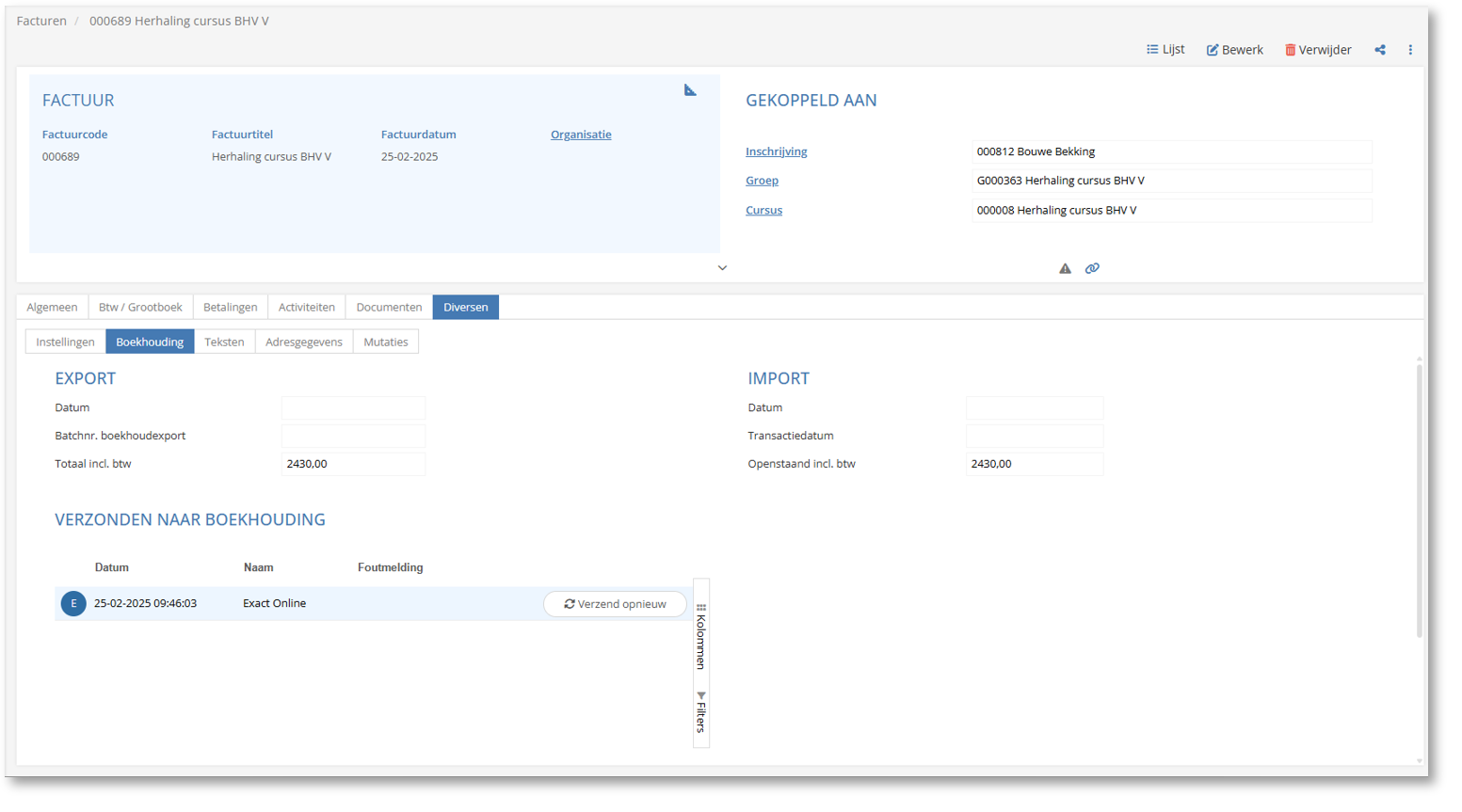 Bied de factuur opnieuw aan aan het boekhoudsysteem via de knop 'Verzend opnieuw'