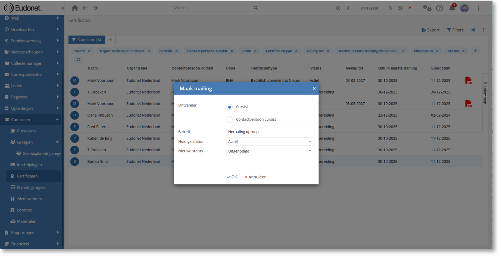 Bij het aanmaken van een mailing voor certificaten is het nu mogelijk om in bulk de status van certificaten aan te passen.